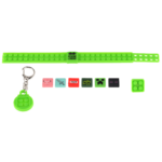 Сет от зелена силиконова гривна пиксели Minecraft Pixie Crew, ключодържател и пинче. Дължината на гривната се регулира, за да пасне на китката на всяко дете. Шест броя мулти пиксели на Minecraft Pixie Crew – зомби, криипър, ендермен, диамантен меч, TNT и прасе. * Как работи системата Pixie Crew? Вземете пиксел елемент и го натискате или завъртете върху пинчетата от силиконовия панел. Пикселите остават здраво закопчани и много стабилни, благодарение на системата Pixie-Lock. Откачването (отделянето) им става само в случай на деформация чрез огъване, силна механична интервенция или надраскване на панела. Артикулът е създаден, за да може детето непрекъснато да променя дизайна му.