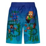 Бански, бързосъхнещи шорти, Minecraft. Комфортни бермуди за всякакви водни спортове на открито и закрито. Еластичен колан с връзки за сигурно пристягане в кръста. Дизайн в морско сини тонове. Принтирани Стив и Алекс с морски мотиви. Мрежест бандаж отвътре на гащетата. Поддръжка: За подходящата грижа за този продукт, моля следвайте инструкциите, посочени на етикета. Състав: 100% полиестер