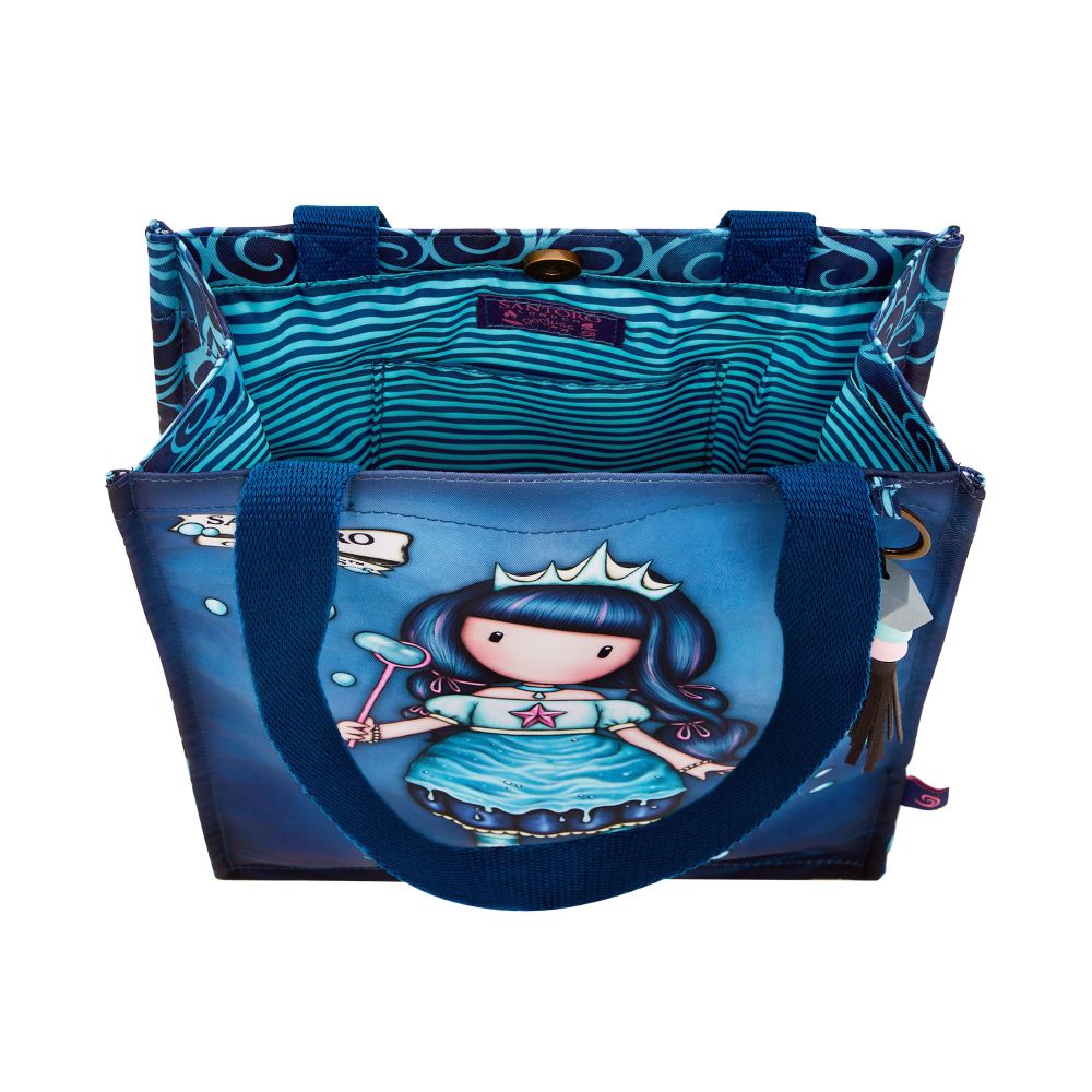Чанта Santoro Gorjuss Walking On Water от колекцията Gorjuss Elements на Santoro London. Практична ежедневна чанта за момичета. Подходяща е за училище, пазаруване, пътуване и е чудесен аксесоар за всеки повод. Чантата е с магичен дизайн в морско синьо, наподобяващ вълни. А върху тях Gorjuss момиче със сини коси, вързани на две опашки, създава водни мехурчета. Закопчава се с магнитно копче. Чантата е с едно отделение и вътрешен джоб, който се затваря с цип с метален накрайник. Към чантата има аксесоар в същия стил – с дървени елементи в различни форми и кожен пискюл. Нежно платнено етикетче с текст Gorjuss от едната страна и перо от другата е прикрепено към долната и част. На гърба ѝ има пришит етикет от кожа и дърво с гравирано логото на марката. Изработена е от 100 % висококачествен полиестер. Размер: 35.5 x 25.5 x 9.5 см. Класическите природни елементи, земя, въздух, огън и вода, които се смятат за материалната основа на физическия свят, са били възхвалявани в продължение на векове. Вдъхновени от тази древна философия Santoro създават четири нови, уникални момичета на Gorjuss, които позволяват на феновете си да проектират в тях личните си рождени знаци. Представяме ви новите героини на Gorjuss: Земната фея Танцуващата върху облачета Момичето с огнено сърце Ходещата по вода Съвременна, но и непреходна колекция от практични чанти и аксесоари, тази нова линия от лайстайл продукти на Gorjuss е създадена предимно за практична ежедневна употреба. Кой природен елемент сте Вие? Кое в вашето Gorjuss момиче?