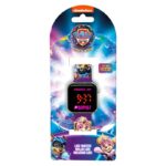LED електронен часовник с дизайн на Paw Patrol. Часовниктът показва в червени цифри час, минути и секунди. Работи в 12 и 24 часов режим. В режим на дата часовникът показва ден и месец. Появява се след повторно натискане на бутон. Дисплеят оставя в спящ режим на черен екран докато детето не натисне бутон, за да провери колко е часа. Тогава червени пиксели „заливат“ концентрично дисплея и предшестват визуализиране на часа. След няколко секунди цифрите отново изчезват и дислеят заспива, като на черен фон остава да контрастират принтове на Super Mario. Часовникът включва 1 бр. батерия CR2032(1,5V). Часовникът не е водоустойчив! Подходящ е за деца над 3 години.