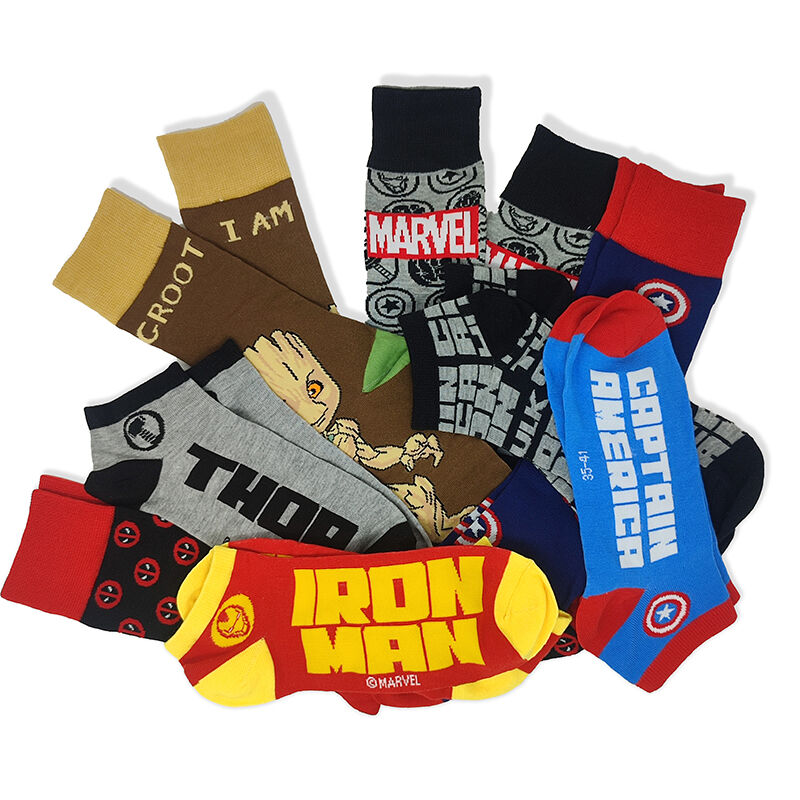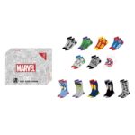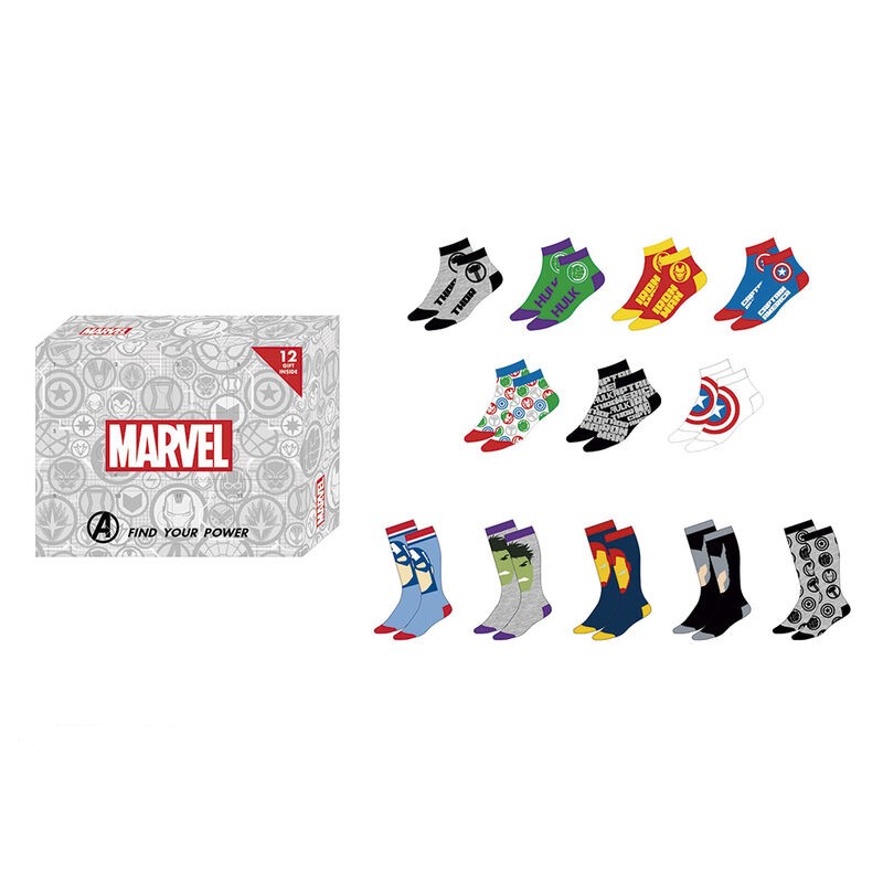Подаръчна кутия Avengers с 12 чифта чорапи с ексклузивен дизайн на Avengers. Съставът е 65% Памук, 33% Полиестер 2% Еластик. Размер: 40/46.