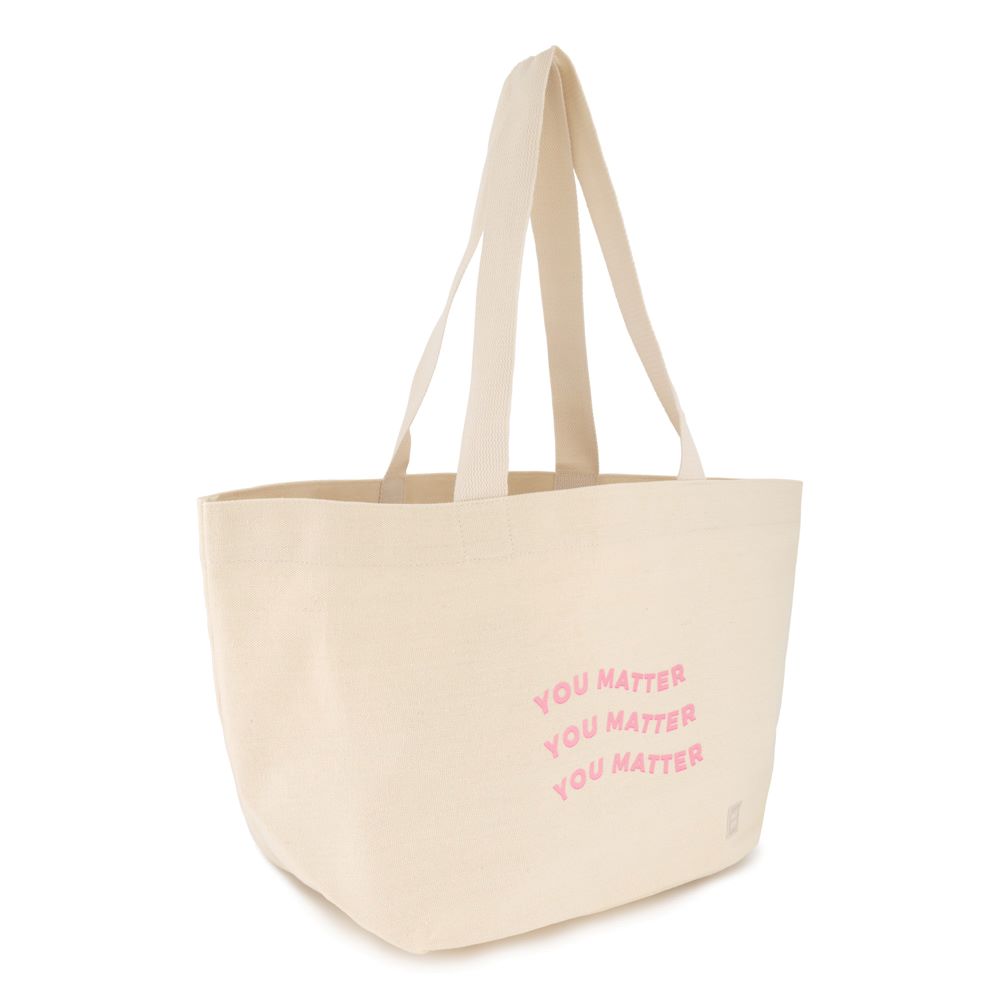 Страхотна голяма чанта от текстил, в бял цвят с розов надпис „You Matter“. Подходяща както за плаж, разходки и шопинг, така и за ежедневието. Разполага с едно голямо, основно отделение, в което може да съберете всичко необходимо за деня. Има и допълнителен отделен малък джоб, който се затваря с цип с кожен накрайник. В него могат да се прибират по-важни вещи като телефон, документи, портмоне или ключове. Чантата разполага с две странични дръжки и може да се носи в ръка или на рамо. Материал: 100% органичен памукРазмери: 31 x 34 x 27 cm