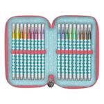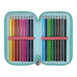 Ученически троен несесер със съдържание Gorjuss Washed Ashore от колекцията Making Waves. Несесерът е в характерния приказен стил на Santoro Gorjuss, този път вдъхновен от летните емоции. Със своите преливащи се цветове, блестящи елементи и ципове с накрайници във формата на миди ще те пренесе на пясъчния морски бряг. А във всяко от трите отделения ще намериш всичко необходимо за училище: 18 цветни молива 18 флумастера 3 химикала – син, черен, червен 1 молив HB Гума Линия Триъгълник Транспортир Острилка Размери: 12.5 x 21.5 x 6.5 см