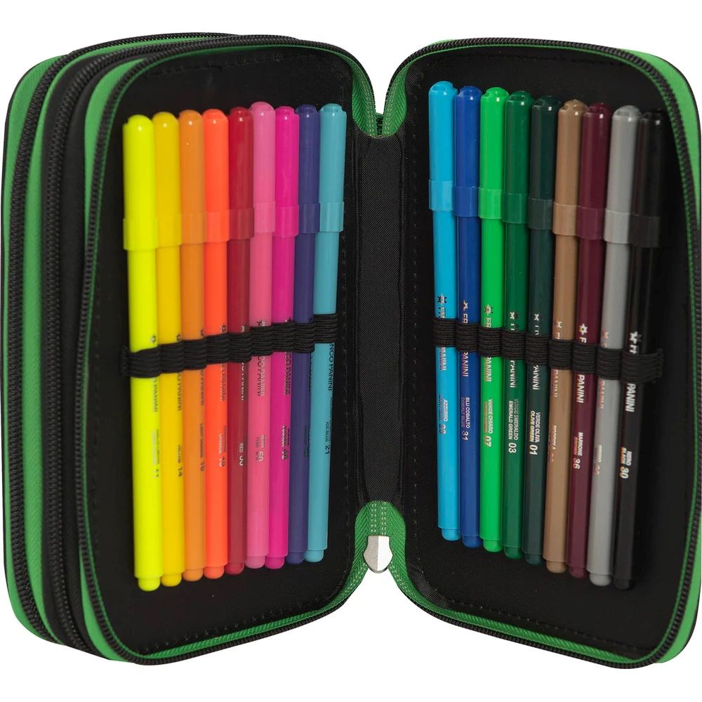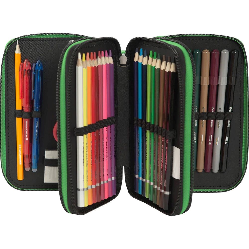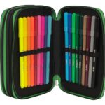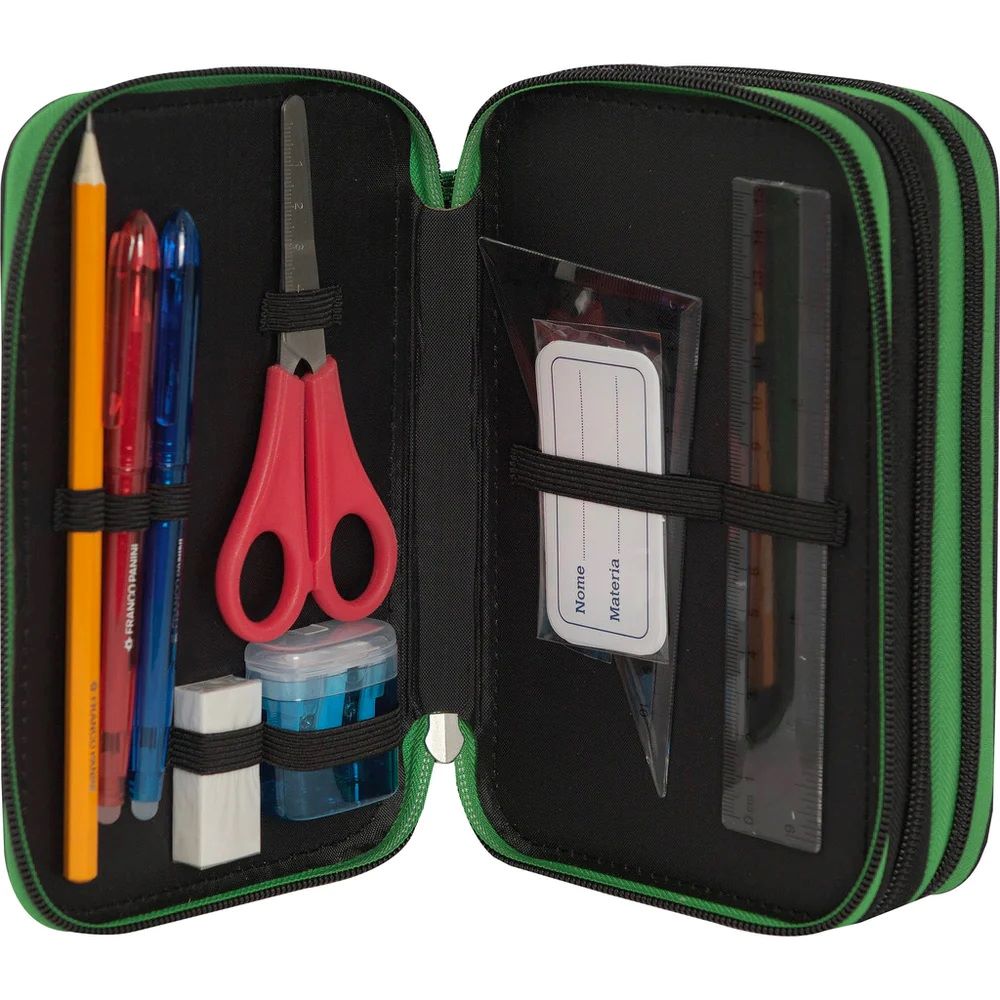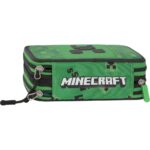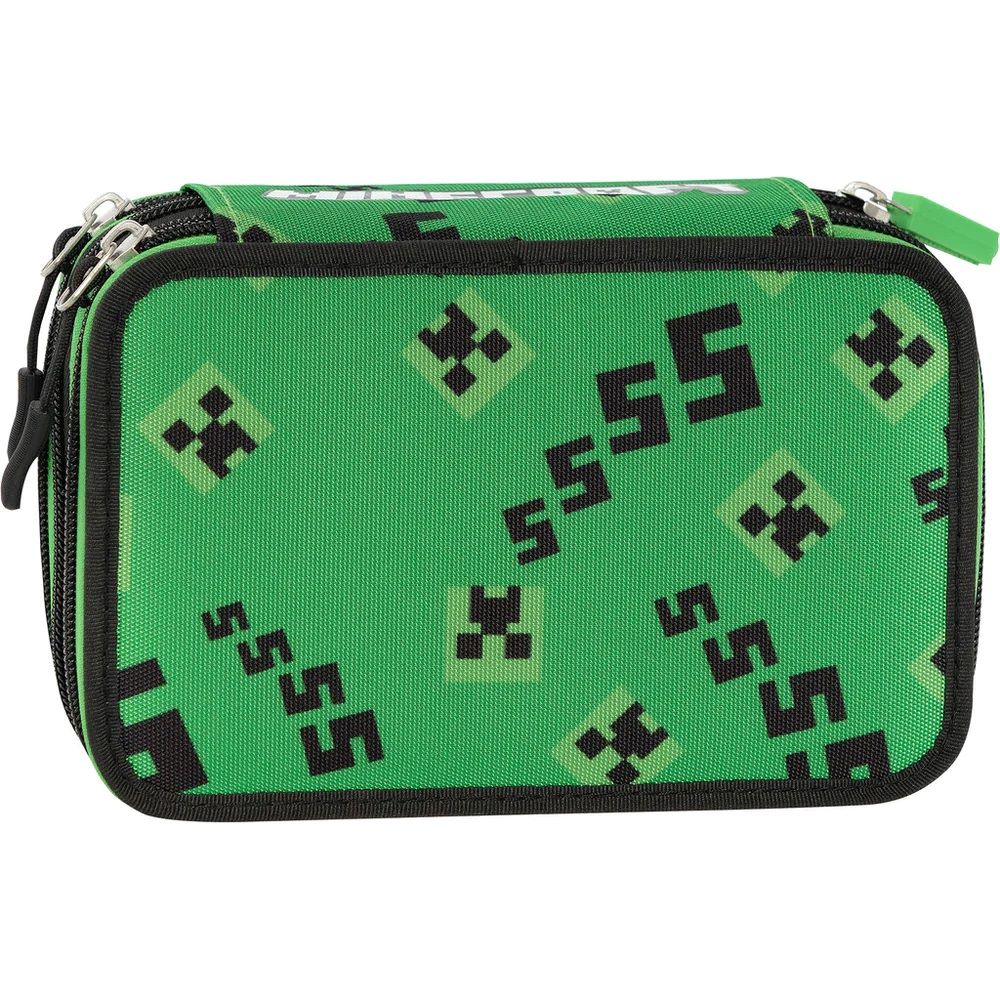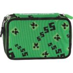 Ученически троен несесер Minecraft Pixel със съдържание: 18 бр. разноцветни флумастера, номерирани по цветовата скала; 18 бр. разноцветни молива, номерирани по цветовата скала; 1 бр. черен графитен молив HB; 1 бр. триещ се червен химикал; 1 бр. триещ се син химикал; 1 бр. гумичка; 1 бр. острилка за 2 размера моливи с контейнер и капаче; 1 бр. линия; 1 бр. триъгълник; 1 бр. ножичка; 1 пакетче с 5 бр. етикети за учебници и тетрадки. Размери: височина – 20 cm, ширина – 13 cm и дълбочина – 7 cm Преден панел с плътен гумиран релефен принт на главата на Creeper. Три черни на цвят стабилни ципове. Два текстилни накрайника и един гумен, зелен, брандиран накрайник. Бял, плътен принт Minecraft на страницата. Кубични глави и SSS елементи на задния панел.