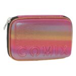 Цветен ученически несесер с лакирано покритие от пресована пяна. Атрактивен дизайн на несесер със съдържание. В основното отделение на твърд разделител под формата на „хармоника“ в ластичета са разположени 18 цветни молива и 18 флумастера от италианската марка COMIX. Има допълнителен вътрешен прозрачен джоб с цип, в който са поставени линия, ножичка, острилка, гума, червен и син химикал, и черен графитен молив. Щампован обемен надпис COMIX. Твърдостта на предния и задния панел действат като черупка и предпазват от счупване качествените канцеларски материали. Затваряне на несесера със здрав и масивен цип с брандиран метален накрайник. Размери: 22 x 14 x 7 cm